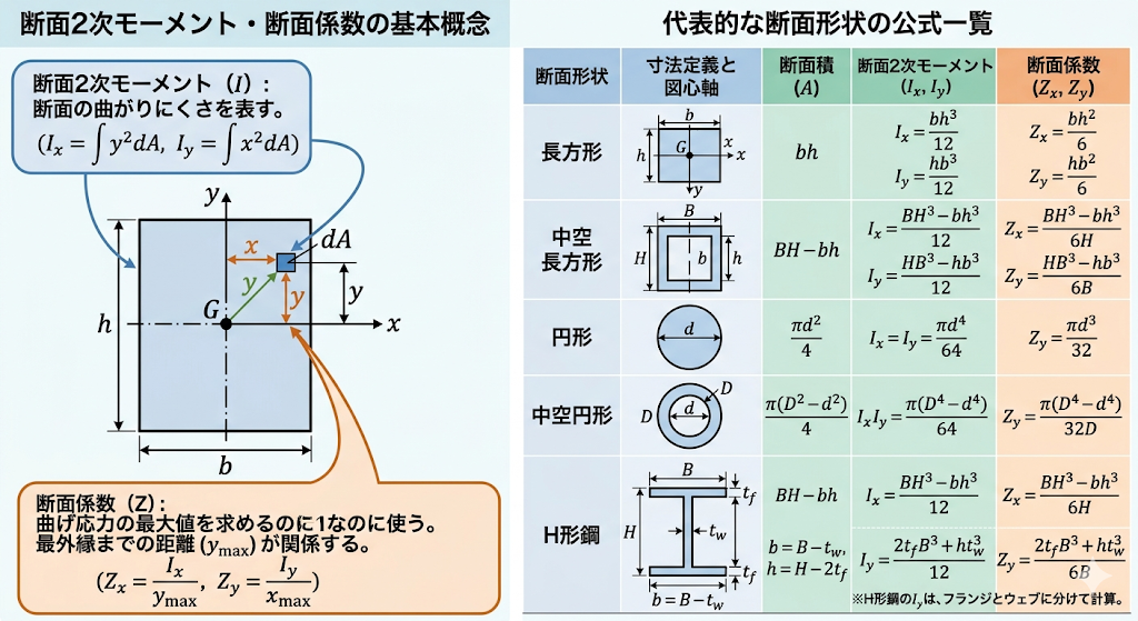 | 矩形長方形 | bh³ / 12 | bh² / 6 | b:幅、h:高さ |
