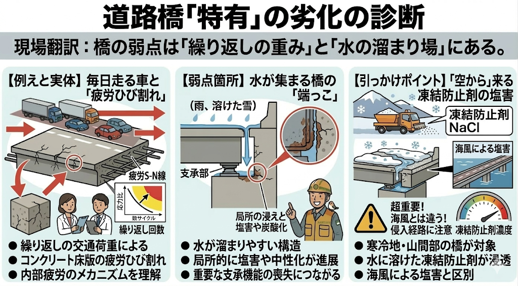 道路橋「特有」の劣化として、以下の3つが頻出です。