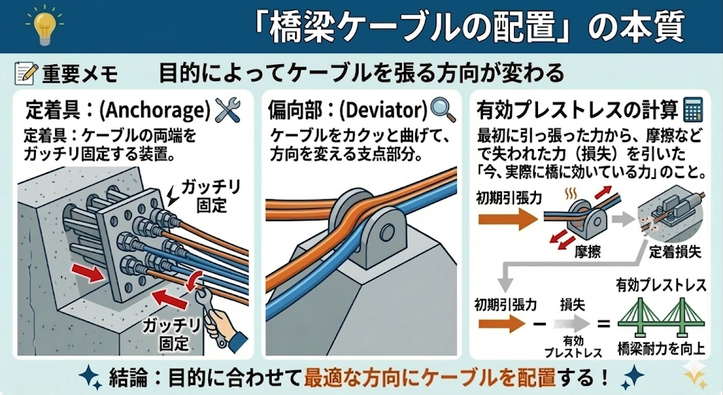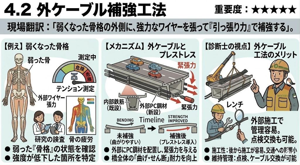 この「外ケーブル補強工法」、非常に奥が深く試験でも超重要なので、