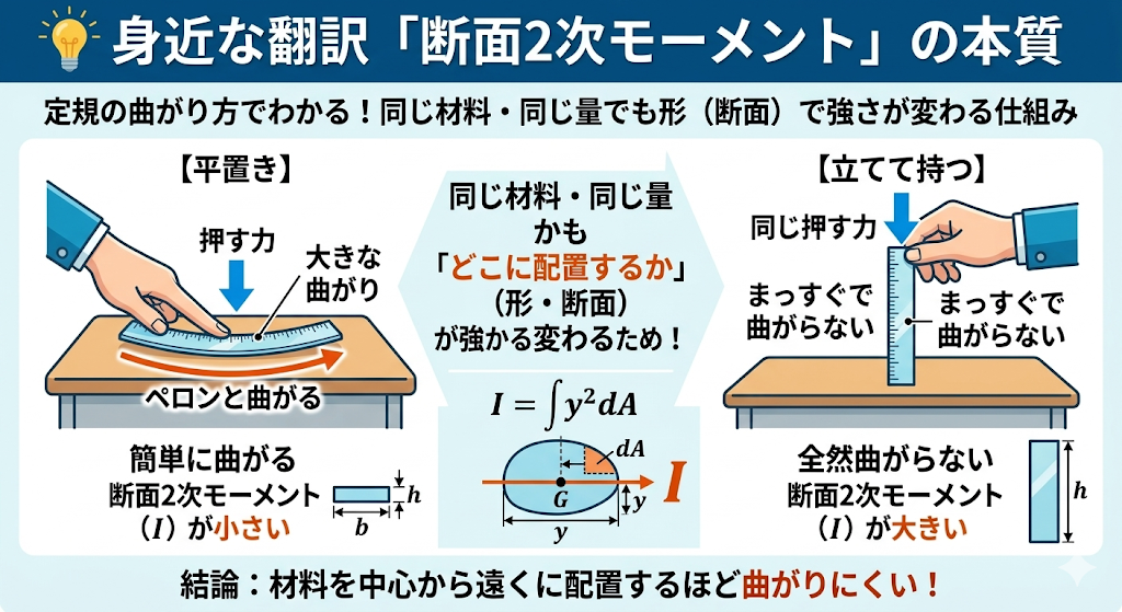 重要なのは、同じ面積の材料でも、中心から遠い位置に配置するほど値が大きくなる(曲がりにくくなる)ということです。