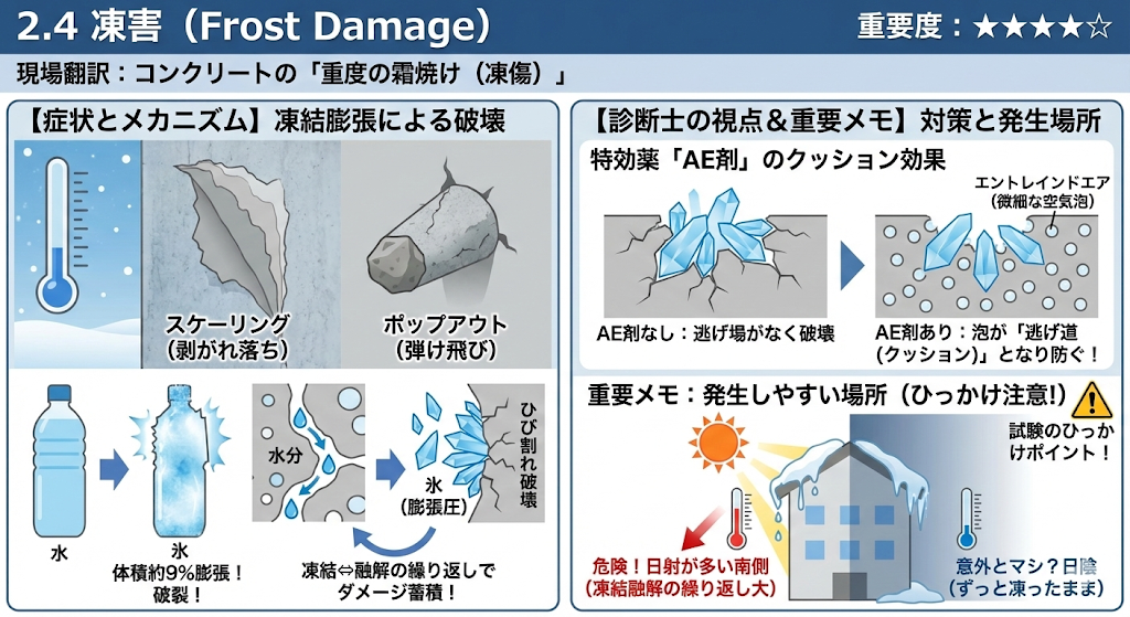 コンクリート内部の微細な隙間に入り込んだ水分が、冬の寒さで「氷」になります。水は氷になると体積が約9%膨張します。満杯のペットボトルを冷凍庫に入れると破裂するのと同じで、この膨張圧に耐えきれずにコンクリートが破壊されます。凍結と融解(溶けること)を繰り返すことでダメージが蓄積します。 - 診断士の視点(試験のポイント)