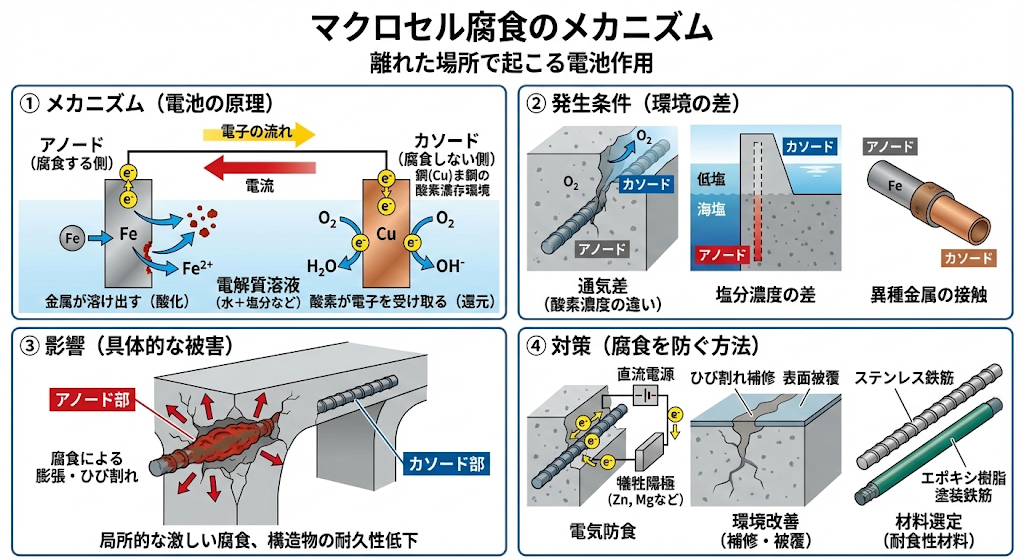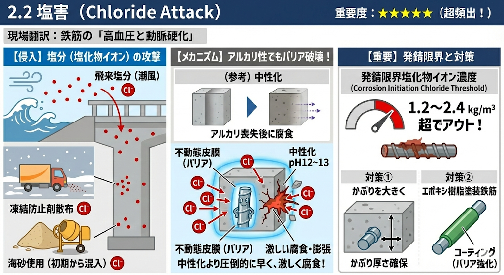 中性化と比べて恐ろしい点は、「コンクリートがアルカリ性のままでも、塩化物イオンが一定量を超えるとバリア(不動態皮膜)を破壊してサビさせる」という点です。つまり、中性化よりも圧倒的に早く、しかも激しく鉄筋が腐食します。 - 診断士の視点(試験のポイント)