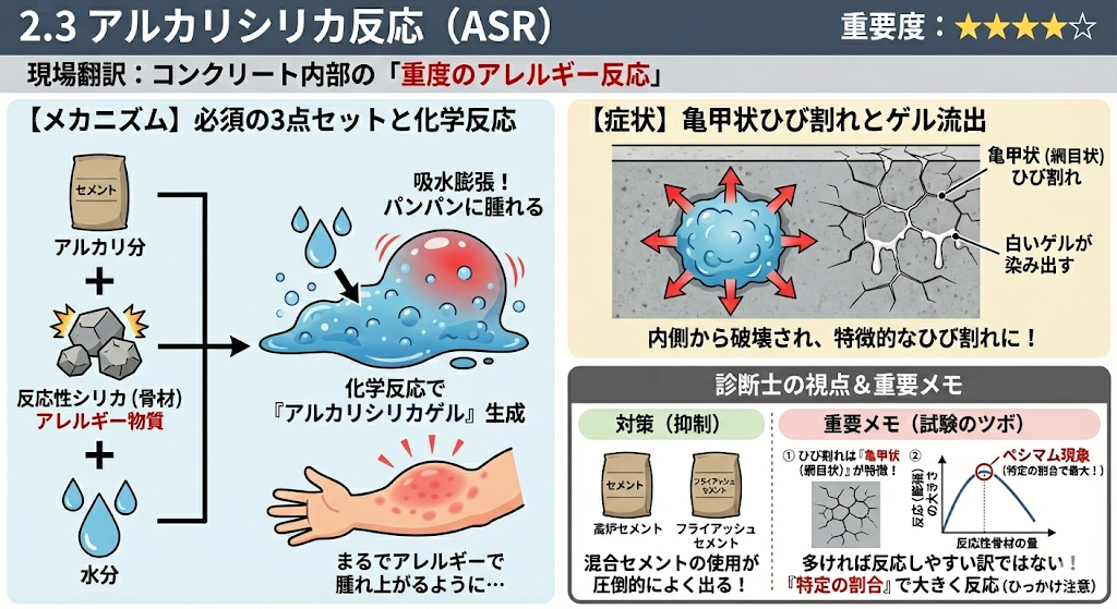 ASRが起きるには「アルカリ」「反応性骨材」「水分」の3点セットが必須です。どれか1つでも欠ければ発生しません。試験では抑制対策として「高炉セメントやフライアッシュセメント(混合セメント)の使用」が圧倒的によく出ます。 - 重要MEMO