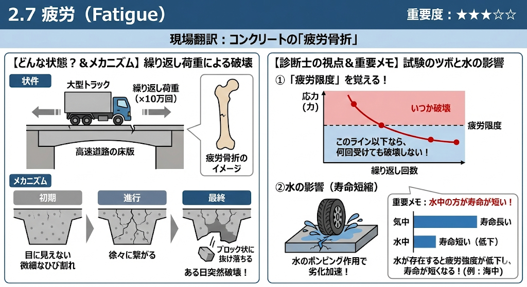 重いトラックが何万回、何十万回と通過することで、コンクリートに「繰り返し荷重」がかかります。1回の重さでは壊れない荷重でも、何度も何度も繰り返されることで金属疲労のように限界を迎え、ある日突然破壊に至ります。 - 診断士の視点(試験のポイント)