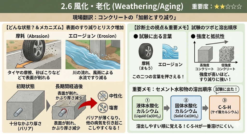 試験での出題頻度は低めですが、「摩耗」や「エロージョン(水流によるすり減り)」といった言葉で出題されます。コンクリートの強度(圧縮強度)が高いほど、すり減りに対する抵抗性も高くなります。 - 重要MEMO