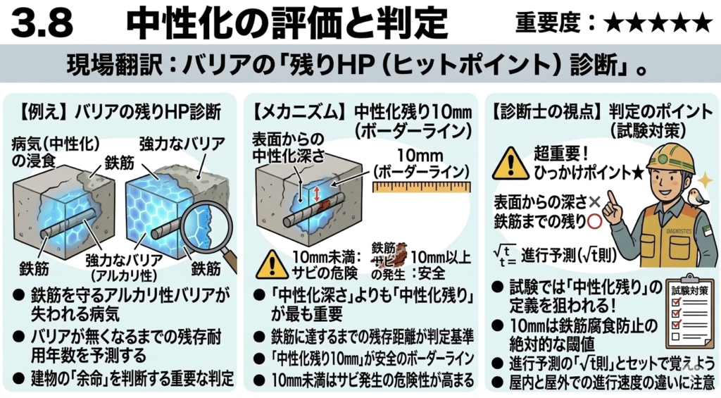 評価の絶対的基準は「中性化残り20mm」です。表面から何ミリ進んだかではなく、「鉄筋に到達するまで、あと何ミリ残っているか」が最も重要です。そして、この残りの距離が「20mm」という基準値が、ボーダーラインであると判定します。ちなみに塩化物を含まないコンクリートで「8mm」が基準です。 - 診断士の視点(試験のポイント)
