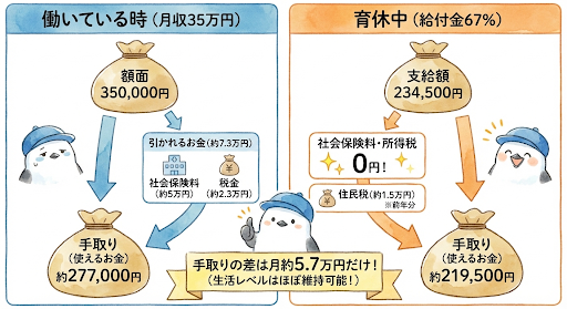 つまり、「休んでいるのに、働いている時とほぼ同じ金額が口座に残る」という夢のような状態になります。