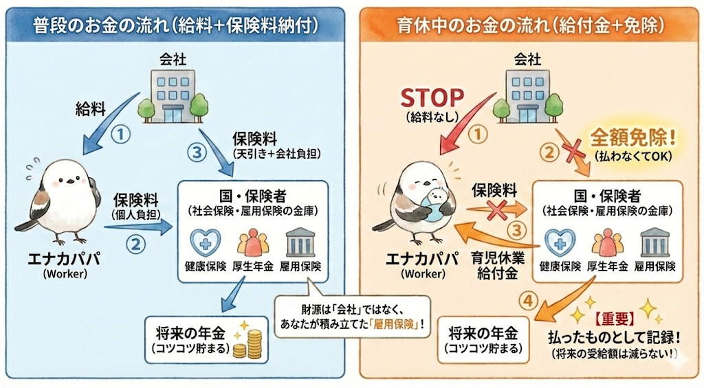 育休中に免除された期間は、「保険料を納めたもの」として扱われます。将来受け取る年金額は1円も減りません。これほど優遇された制度は、他にはありません。この辺の知識は普段触れてないとわからないですよね。